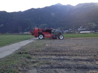 Nach etwa 20-25 Wochen wird der Chicorée geerntet. Zuerst wird mit einem Mulcher das Blattwerk entfernt, anschliessend wird die Wurzel vom Chicorée mit einer Maschine ausgegraben und aufgeladen.
